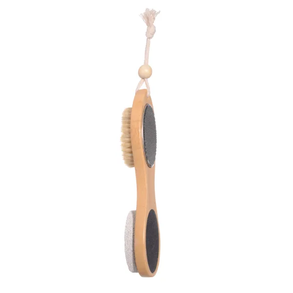 Cepillo 4 usos para el cuidado de los pies. Cuenta con cerdas naturales, piedra pómez volcánica, escofina delicada de metal y lima suave.